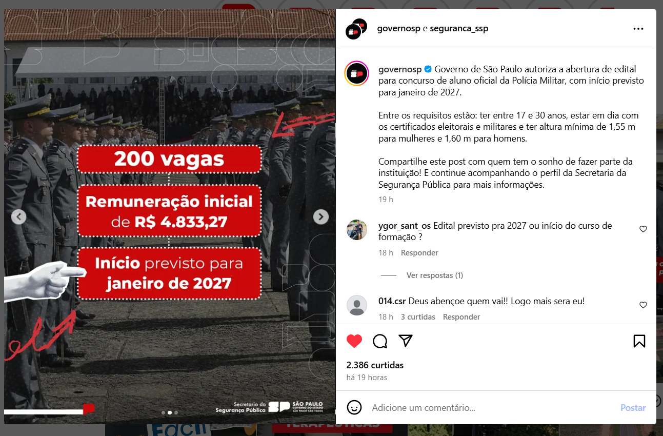 Vale destacar que o último concurso PMSP Oficial foi realizado em julho deste ano (2025). A instituição ofertou 165 vagas imediatas para Aluno-Oficial, que exige nível médio de formação.