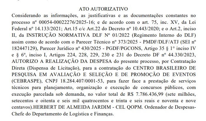 Diante dessas informações e da alta procura pelos concursos da PMDF, a banca Cebraspe se apresenta como uma organizadora experiente e confiável, por isso a sua escolha. Confira aqui a publicação no DODF com a autorização.