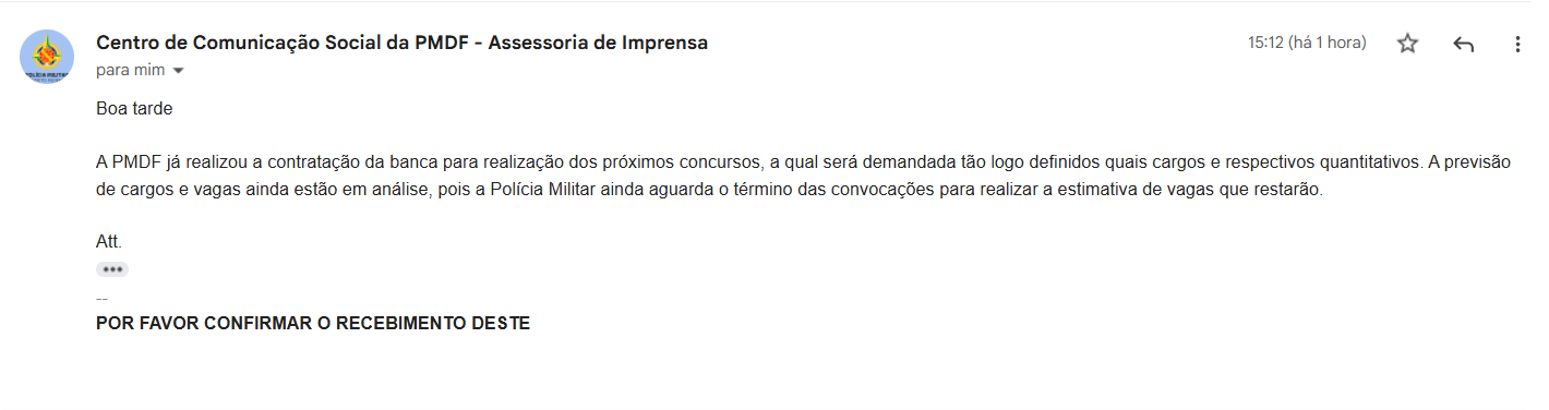 Novidade importante sobre o Concurso PMDF! Em resposta ao Gran, a Polícia Militar do Distrito Federal informou que a previsão de cargos e vagas para novo concurso estão em análise.