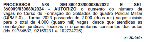 Novidades sobre o concurso PMERJ! De acordo com o processo disponível no SEI, o Governador Cláudio Castro autorizou a ampliação de 2 mil para 4 mil vagas no Curso de Formação de Soldados do edital de 2023.