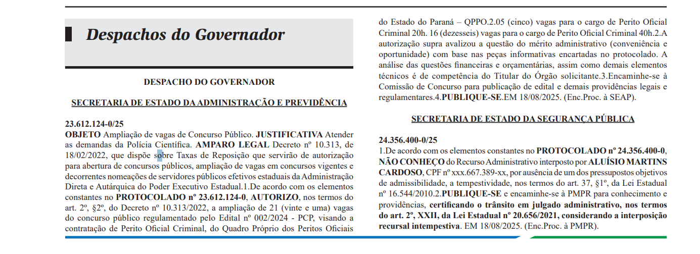 - 25 de agosto de 2025: ampliação de vagas para Técnico de Perícia Oficial e Perito