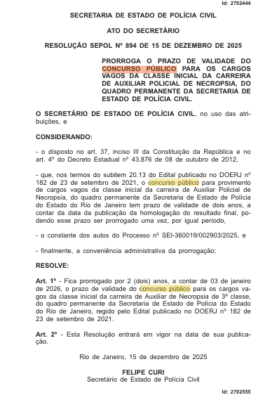 - 15/12/2025: Validade do edital para Auxiliar de Necropsia prorrogada até 2028