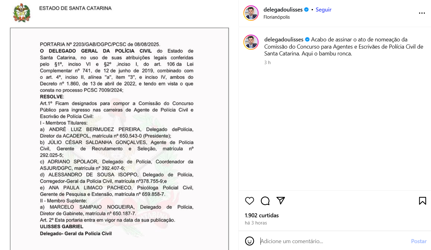 Acabo de assinar o ato de nomeação da Comissão do Concurso para Agentes e Escrivães de Polícia Civil de Santa Catarina“, disse em publicação nas redes sociais.