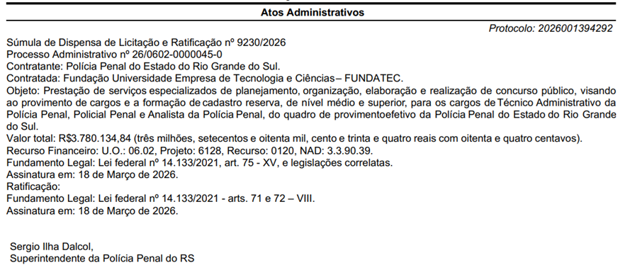 Embora a escolha da banca para a Polícia Penal do Rio Grande do Sul já fosse de conhecimento público, a publicação oficial do contrato é a etapa administrativa final que precede a abertura do certame. Com isso, o edital pode ser publicado a qualquer momento.
