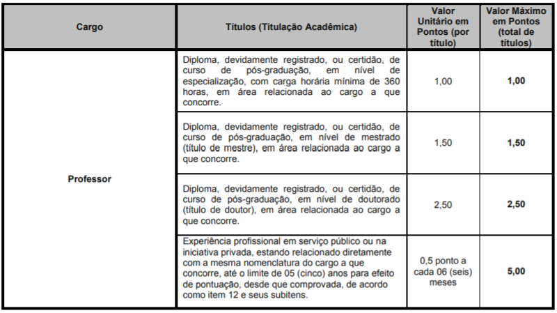 - Prova de Títulos, de caráter classificatório, para o candidato ao cargo de Professor.
