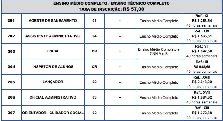 O valor das inscrições é de R$ 45,00 para cargos de nível fundamental, R$ 57,00 para nível médio e técnico e R$ 72,00 para nível superior.