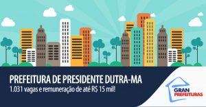 A Prefeitura de Presidente Dutra, no estado do Maranhão, lançou edital de concurso público com 1031 vagas em todos os níveis escolares. Do total de oportunidades, 413 são imediatas e 618 destinadas para formar cadastro de reserva. Para jornada de trabalho de 40 horas semanais, os salários chegam a R$ 15 mil!