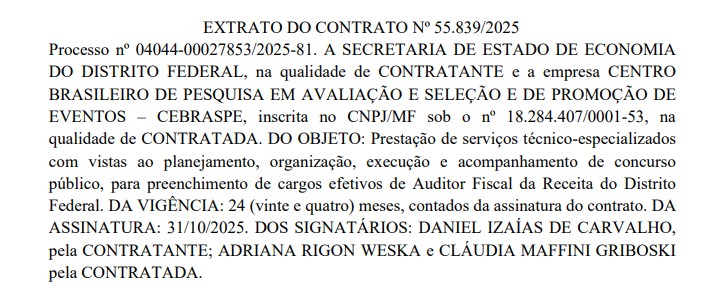 Novidades sobre o concurso Sefaz DF! A Secretaria de Economia do Distrito Federal – SEEC DF confirmou que o edital do concurso deve ser publicado até 60 dias após a assinatura do contrato com a banca, o que indica que o documento para elaboração do edital deve ficar disponível por volta de 10 de dezembro.