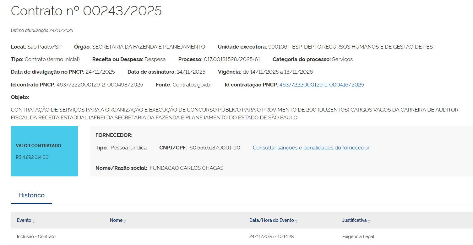 A Secretaria da Fazenda de São Paulo (Sefaz SP) anunciou nesta segunda-feira (24/11) a contratação da Fundação Carlos Chagas (FCC) como banca organizadora do próximo concurso público, conforme publicação no PNCP.