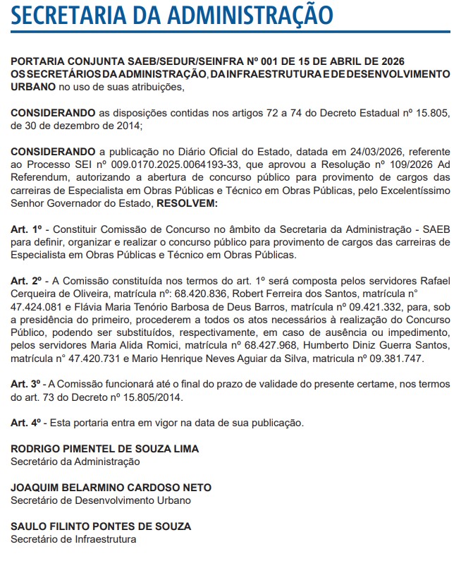 A constituição da equipe responsável pelo concurso SEINFRA BA foi oficialmente formalizada por meio da Portaria Conjunta SAEB/SEDUR/SEINFRA Nº 001, publicada no Diário Oficial do Estado. A autorização para a abertura do concurso público já havia sido aprovada por meio da Resolução nº 109/2026, publicada em 24/03/2026.