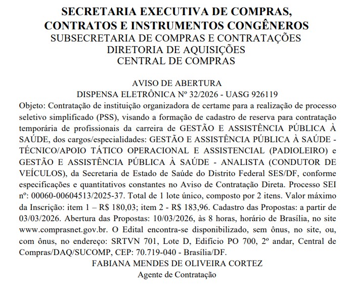 É oficial! O próximo concurso SES DF Temporários iniciou o processo de seleção da banca organizadora. As instituições interessadas deverão enviar propostas a partir do dia 10 de março, confira o documento na íntegra em “situação atual”.