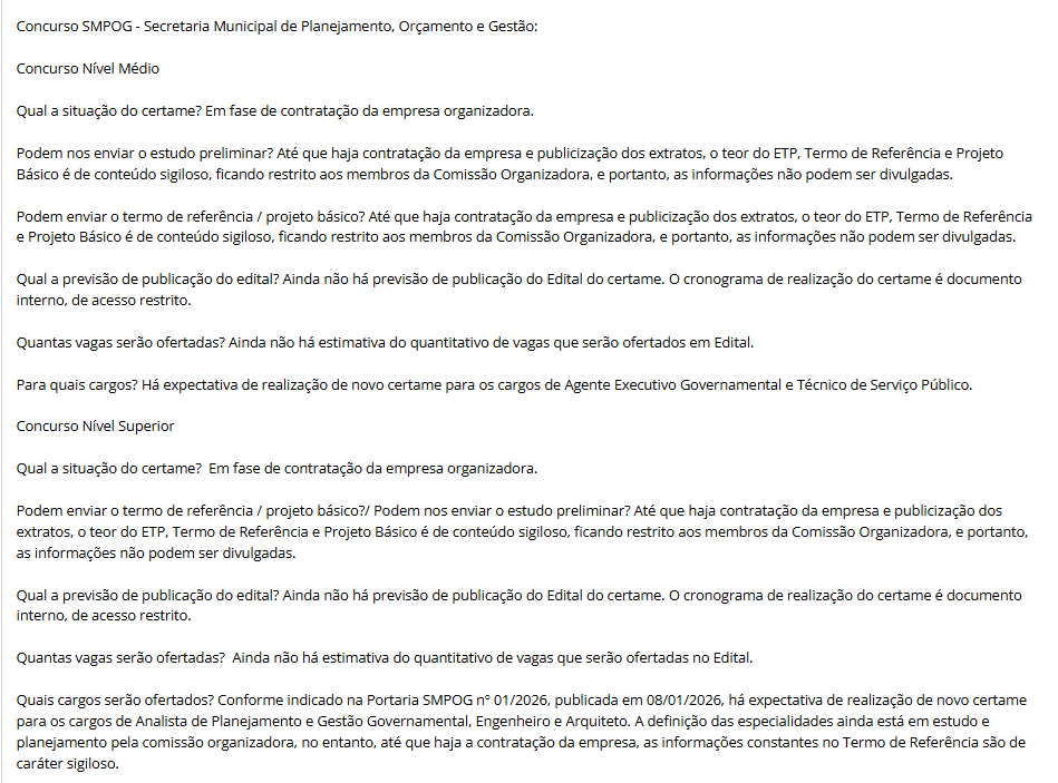 O Concurso SMPOG BH vem aí! Em contato com a equipe Gran, por meio da Lei de Acesso à informação (LAI), a Secretaria Municipal de Planejamento, Orçamento e Gestão informou que o certame está atualmente em fase de contratação da banca organizadora.