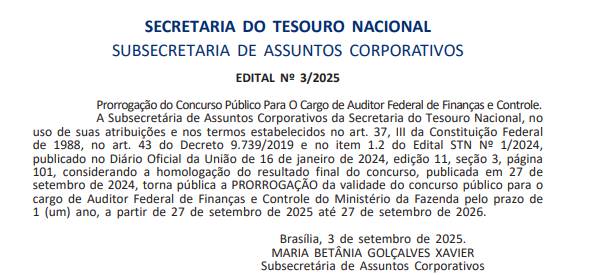 Atualizações sobre o concurso STN! Foi prorrogado o concurso para o cargo de Auditor Federal de Finanças e Controle da Secretaria do Tesouro Nacional pelo prazo de 1 ano, a partir de 27 de setembro de 2025 até 27 de setembro de 2026.