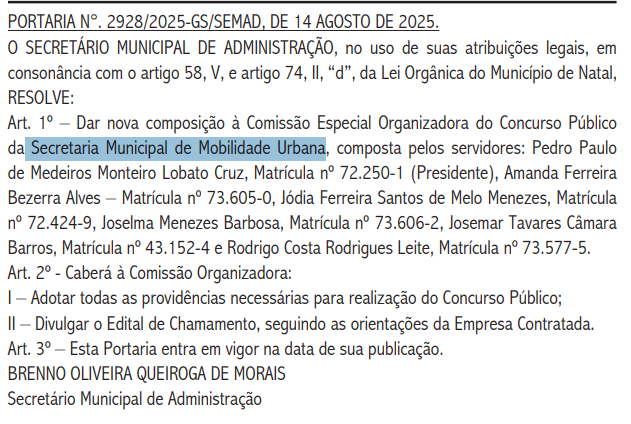 O Concurso STTU Natal RN vem aí! A Secretaria Municipal de Mobilidade Urbana formou a comissão responsável pela organização do edital.