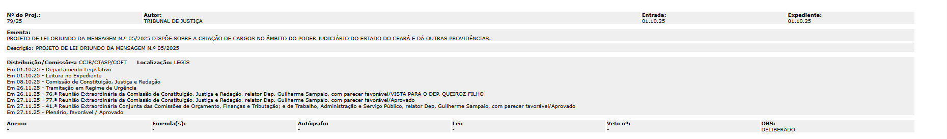 Nesta quinta-feira, dia 27 de novembro de 2025, o Projeto de Lei n.º 79/25, para a criação de 620 vagas de provimento efetivo entre 2026 e 2029, foi aprovado no Plenário da Assembleia Legislativa do Ceará (ALECE).