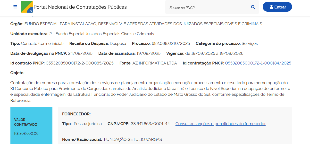 O Extrato do Contrato nº 01.079/2025 foi disponibilizado nesta quinta-feira, 25 de setembro de 2025. Referente a contratação dos serviços de planejamento, organização, execução, processamento e resultado para homologação