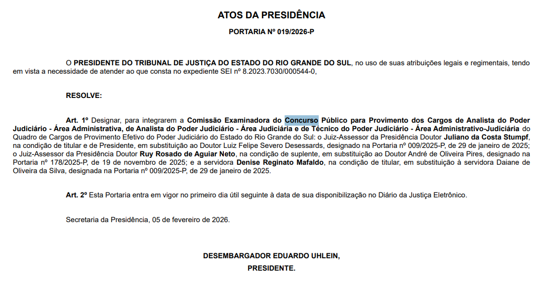 Novidades sobre o concurso TJ RS! No dia 5 de fevereiro de 2026, o Tribunal de Justiça do Estado do Rio Grande do Sul publicou uma portaria que altera a composição da comissão organizadora anteriormente formada, destinada aos cargos de Analista e Técnico do Poder Judiciário.