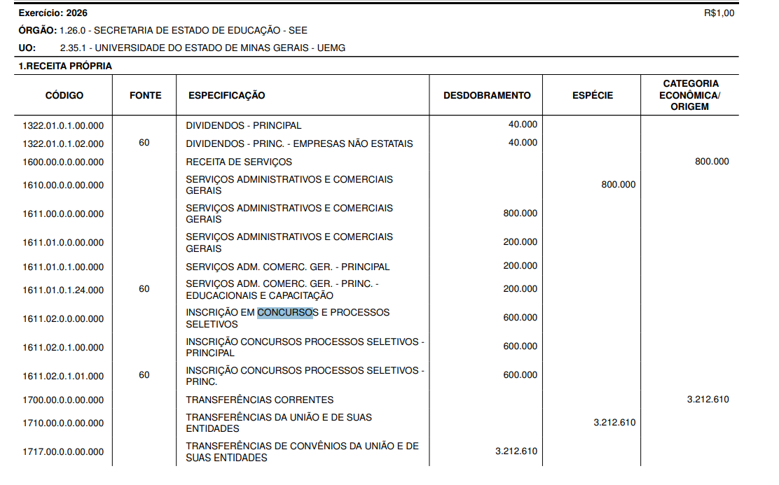 A Universidade do Estado de Minas Gerais foi citada na PLOA 2026. O orçamento pode indicar as nomeações que serão realizadas no próximo ano. Veja em “situação atual”.