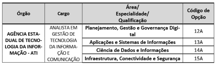 A retificação também trouxe ajustes na formação específica de Nível Superior referente à Agência Estadual de Tecnologia da Informação (ATI). O edital passa a adotar uma nova nomenclatura para os cargos, especialidades e qualificações vinculadas ao órgão, atualizando todas as ocorrências ao longo do documento.