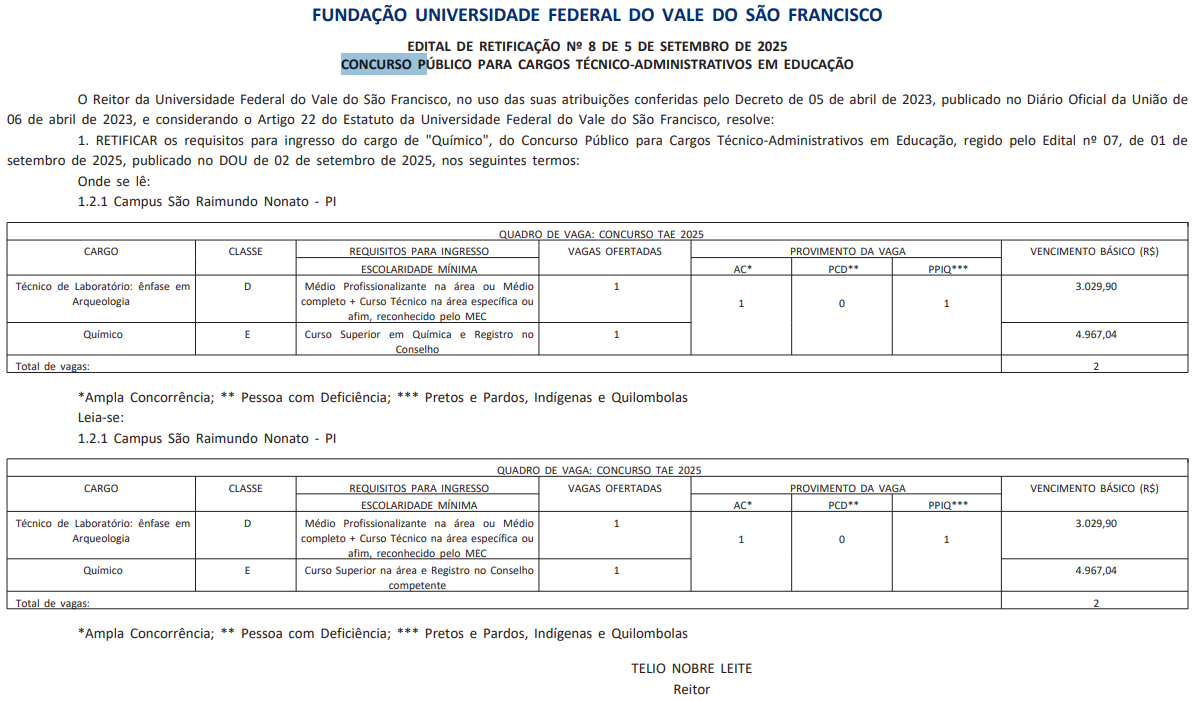 O edital Univasf 2025 indica que a remuneração dos cargos ofertados é a seguinte: