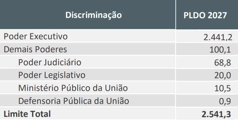Para o exercício de 2027, o limite total de despesa projetado é de R$ 2.541,3 bilhões, sendo que o Poder Executivo detém a maior fatia, com R$ 2.441,2 bilhões.