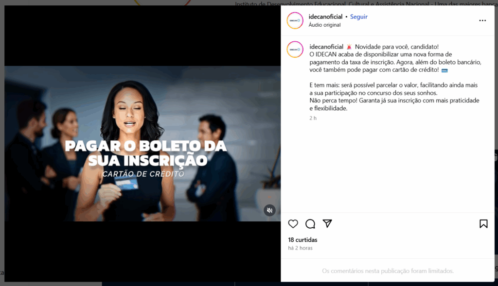 A banca IDECAN anunciou, por meio de publicação em suas redes sociais no dia (30/09), uma importante novidade para quem participa de concursos públicos. Trata-se da possibilidade de realizar o pagamento da taxa de inscrição por meio do cartão de crédito.