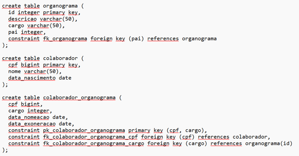 – O modelo como um todo também está normalizado, pois a relação de muitos-para-muitos entre colaborador e organograma foi tratada por meio da tabela associativa colaborador_organograma.