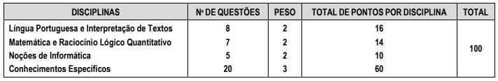 A prova conterá 40 questões de múltipla escolha. Confira na tabela abaixo quais serão as disciplinas, o número de questões, o peso e total de pontos por disciplina: