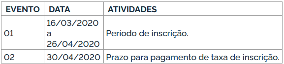 | Inscrições | de 16/03/2020 a 26/04/2020 |