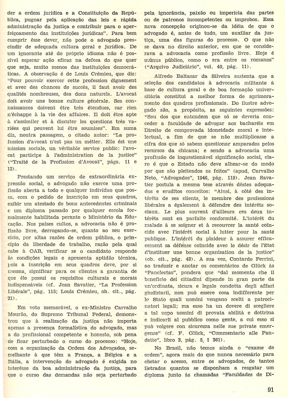 O Exame de Ordem não constitui um segundo vestibular, nem se compara, pela simplicidade das questões que versa, aos concursos de ingresso nas carreiras de especialização profissional, como vem sendo afirmado pelos que combatem a medida moralizadora. As matérias submetidas aos candidatos são simples (…) Trata-se de problemas rotineiros e singelos, perfeitamente ao alcance de um advogado principiante, desde que seu curso de bacharelado tenha sido regular e correto (…) É um sistema destinado a verificar se o candidato reúne as condições mínimas para o exercício de tão nobre profissão, sem o qual pessoas despreparadas intelectualmente estarão patrocinando mal questões relacionadas com o patrimônio, a honra, a liberdade e a própria vida dos clientes que as procurem.