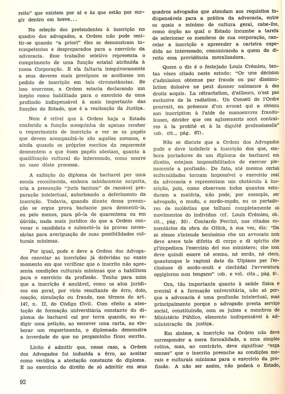 “Para evitar (…) desmoralização total da advocacia, devem os Conselhos Seccionais agir decididamente, com base no art. 28, n. X, da Lei 4.215, de 1963, e indeferir a inscrição aos candidatos que, por palavras, atos ou escritos, se mostrem intelectualmente despreparados para o exercício da profissão (…). É o mínimo que a Ordem poderá e deverá fazer na realização dos seus fins, no aperfeiçoamento da Justiça, até que o legislador se convença da necessidade de se instituir o ‘exame de ordem’ já consagrado pelos povos mais cultos do mundo.”