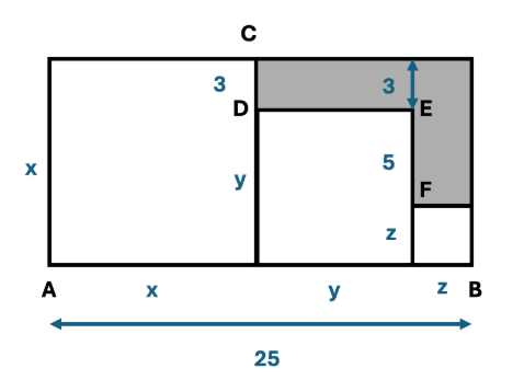 Por fim, a área hachurada pedida pode ser escrita como a soma das áreas de dois retângulos: o primeiro com base igual a ‘y’ e altura igual a 3; e o segundo com base igual a ‘z’ e altura igual a 8.
