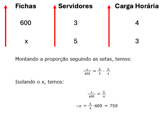 Comentários: Vamos montar o esquema de regra de três, notando que, quanto mais fichas houver para serem preenchidas, maior o número de servidores necessários e maior a carga horária que eles precisariam trabalhar. Então, todas as grandezas são diretamente proporcionais ao número de fichas: