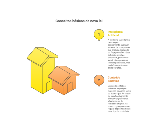 A lei define IA de forma bem ampla: basicamente qualquer sistema de computador que produza conteúdo ou faça previsões. Essa definição ampla é proposital, permitindo incluir não apenas as tecnologias atuais, mas também aquelas que ainda surgirão.