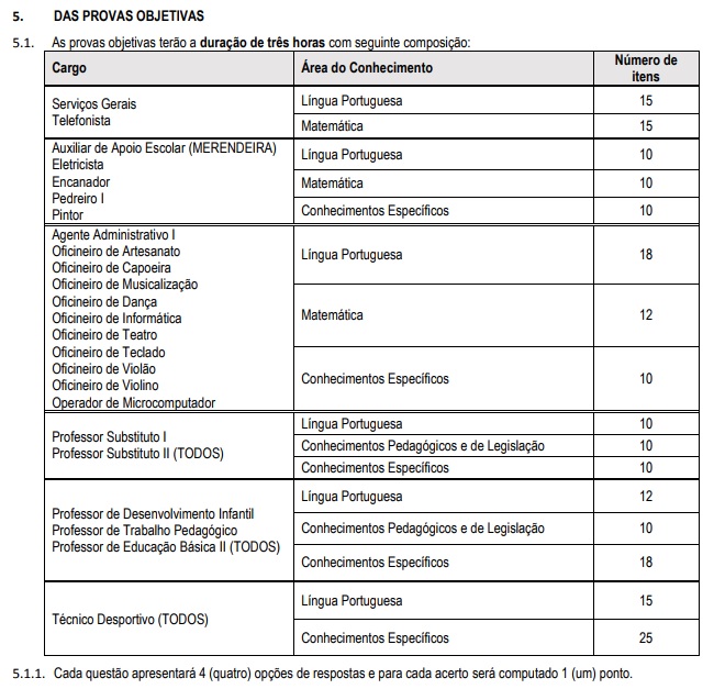 O concurso será composto por prova objetiva no dia 28 de janeiro de 2018. A confirmação da data e as informações sobre horários e locais serão divulgados oportunamente por meio do edital de convocação para a prova, que será disponibilizado no site da banca e no site da prefeitura no dia 19 de janeiro de 2018. Confira os detalhes da etapa para cada cargo: