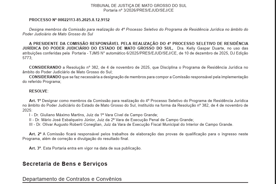 As inscrições no programa de residência podem ser realizadas no período de 10 de dezembro de 2025 a 27 de janeiro de 2026, no endereço eletrônico https://www.tjms.jus.br/concursos/residencia-judicial.