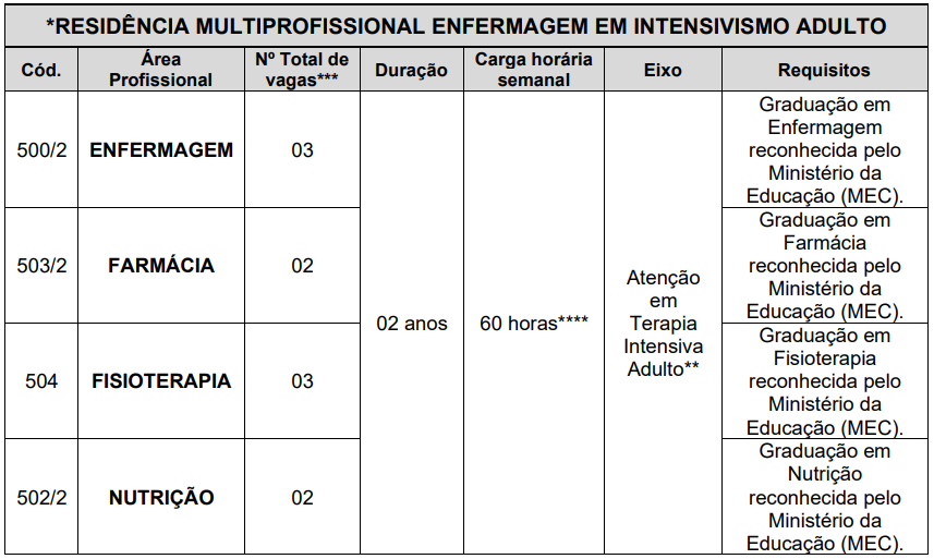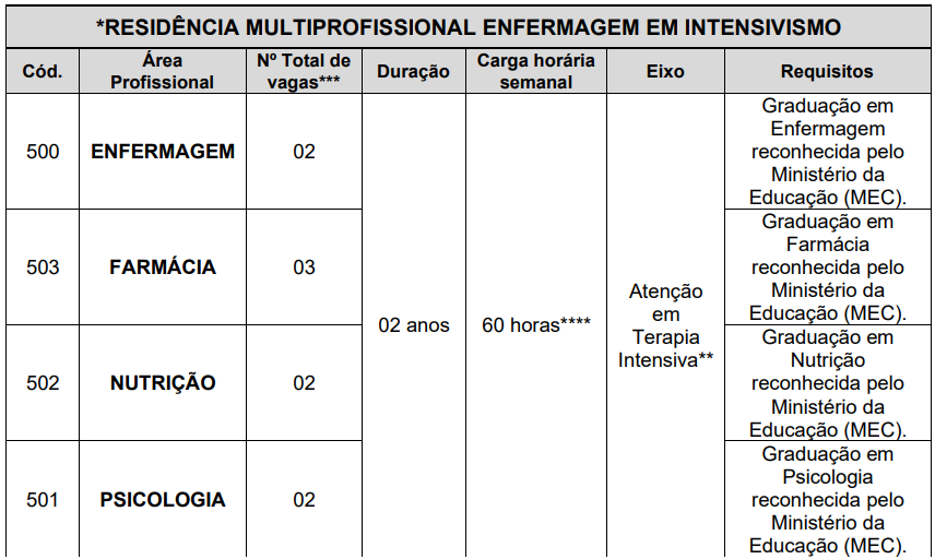 - Intensivismo: 9 vagas em Enfermagem (2), Farmácia (3), Nutrição (2), Psicologia (2);