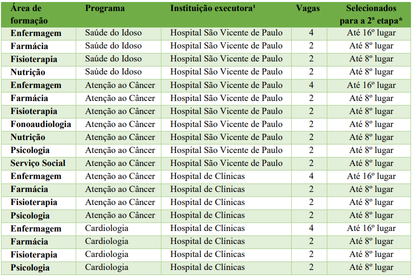 O processo seletivo oferta oportunidade para profissionais graduados das áreas de Enfermagem, Farmácia, Fisioterapia, Fonoaudiologia, Medicina Veterinária, Nutrição, Odontologia, Psicologia e Serviço Social.