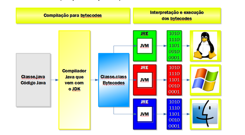 Devido à compilação do código-fonte em bytecode, que é executado pela máquina virtual Java (JVM), os programas Java podem ser executados em diversos sistemas operacionais, sem a necessidade de recompilação.